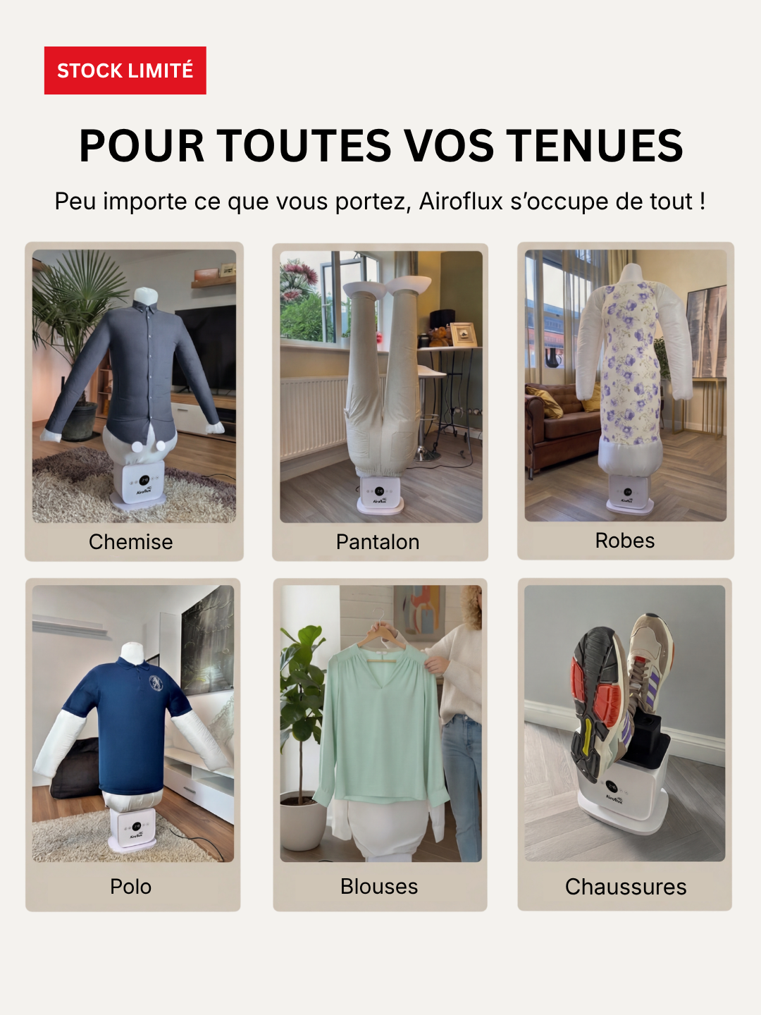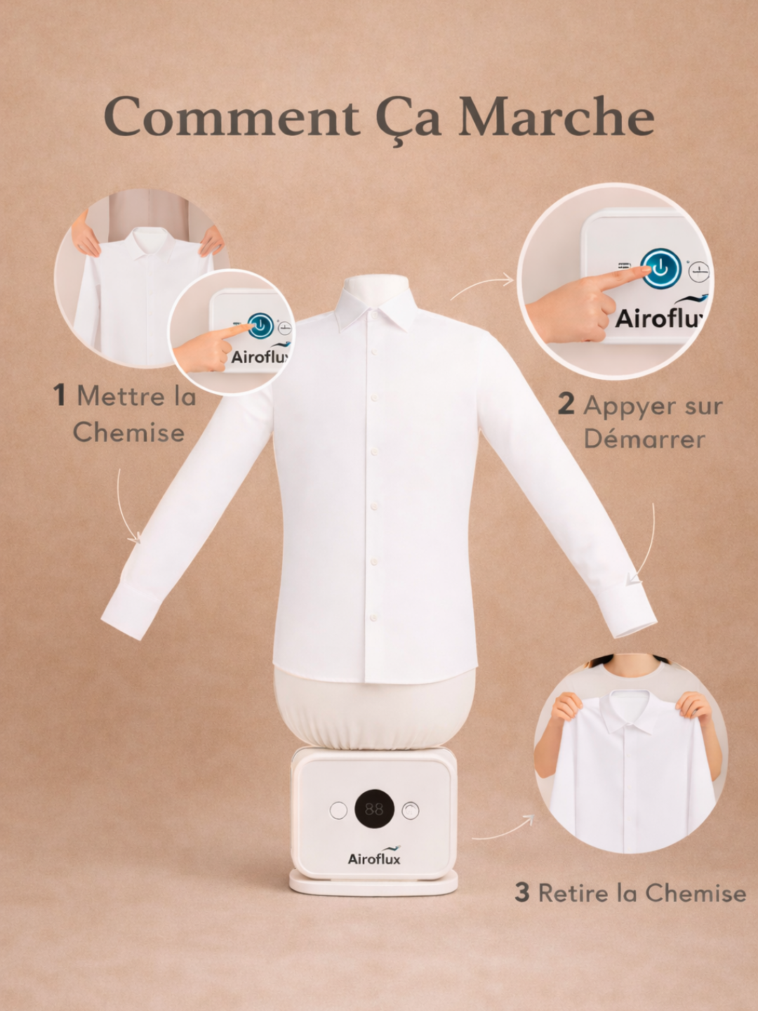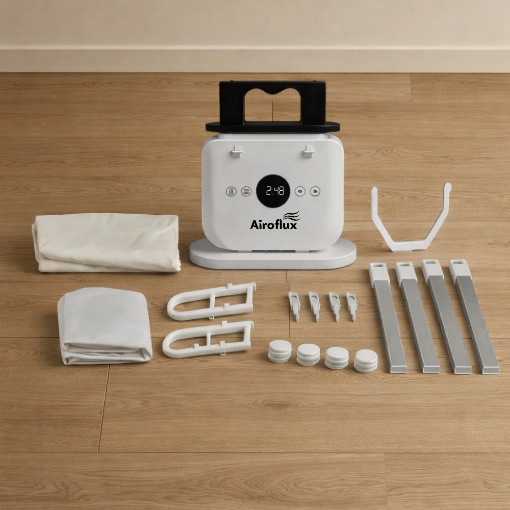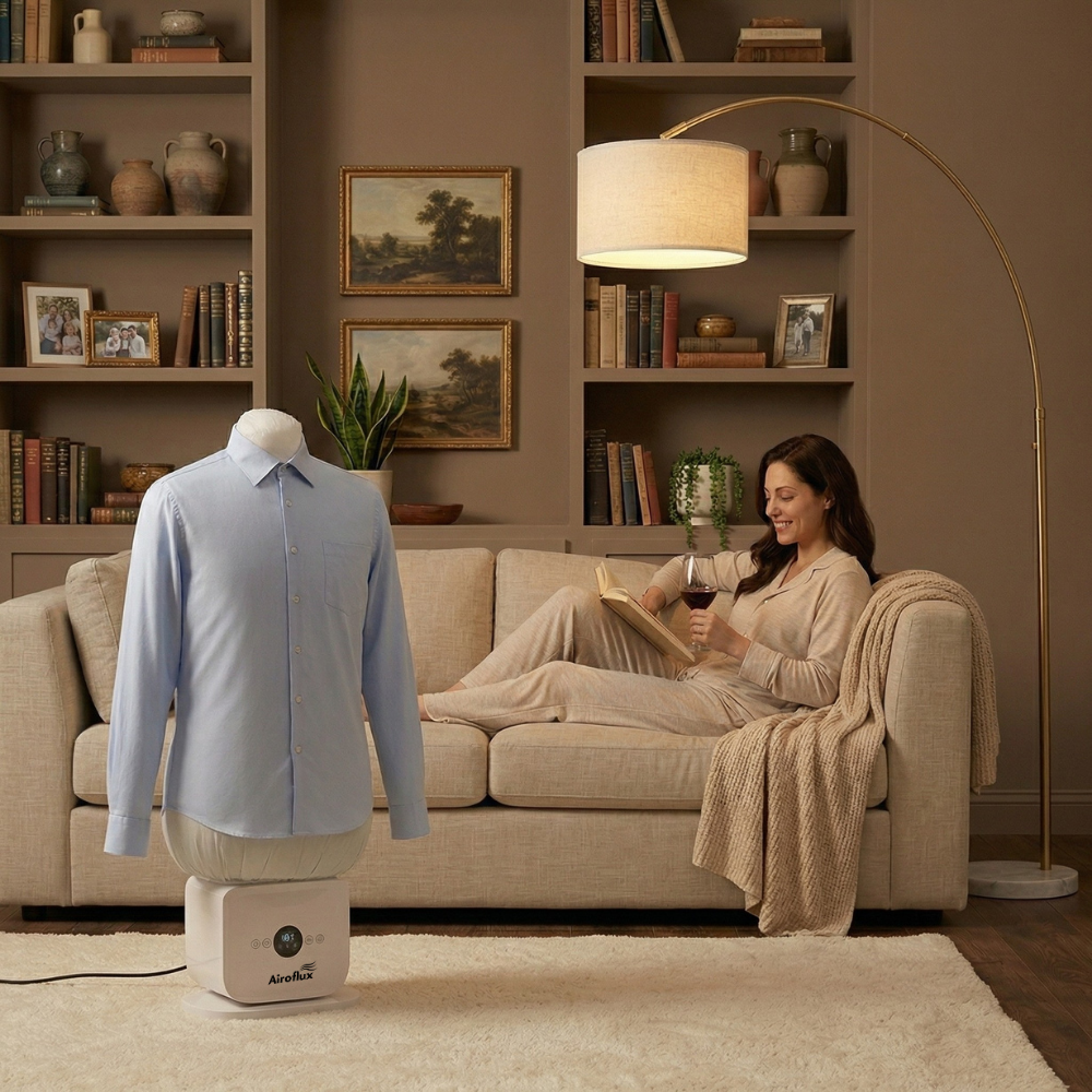 Luxury hotels have used industrial hot-air form tech for decades. No irons (too slow, too risky). No steamers (leave clothes damp). Airoflux uses controlled inflation to stretch fabric taut, apply precise heat, and lock in a crisp press as it dries — now built for your home.